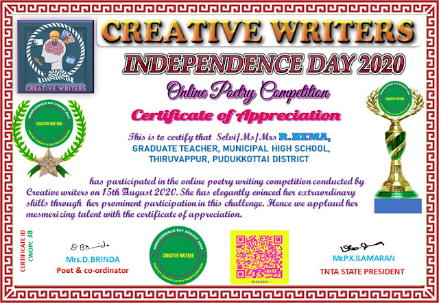 INDEPENDENCE DAY POETRY COMPETITION BY CREATIVE WRITERS RAMESH K,TNTA TECHNICAL TEAM SECRETARY August 12, 2020 CREATIVE WRITERS Edit INDEPENDENCE DAY POETRY COMPETITION BY CREATIVE WRITERSRESULTS DECLARED DOWNLOAD CERTIFICATE CLICK HERE Share on Facebook Share on Twitter Share on Google Plus About RAMESH K,TNTA TECHNICAL TEAM SECRETARY RELATED POSTS